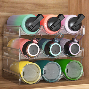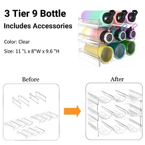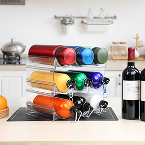 - Easy to Stackable: This water bottle organizer can hold up to 3 bottles on each shelf. Stack to create vertical storage to help maximize your space, Set of 3 (room for 9 bottles)