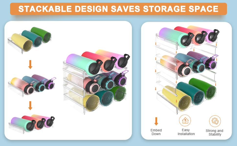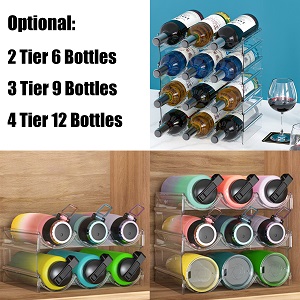 - Quick Assembly and Stackble: No tools required, just 1 minute to assemble. The water bottle organizer rack are easily stackble and can be freely split and combined, you can assemble any tiers you want to maximize the space, such as 1 tier, 2 tiers, 3 tiers, 4 tiers, 5 tiers, 6 tiers and more. You can also refer the install video.It features a stackable design and the stable structure prevents bottles from shaking, tilting, or falling over.